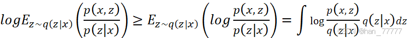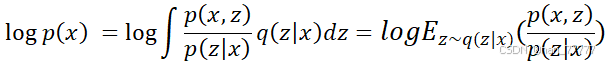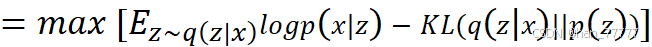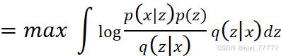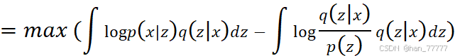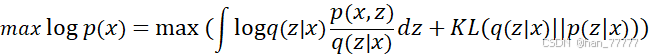 同时为上式引入一个分布qφ(z|x) ,其中φ 为分布q的参数,为方便书写简写为q(z|x) ,这里的q(z|x) 其实就是上文对encoder编码器设置的神经网络,而p(z|x)就是之前假设的多元多维标准正态分布。因此可得,上式得到
