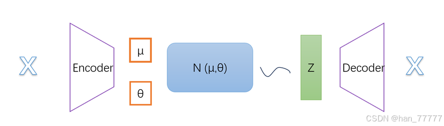 上图是vae模型的基本结构,可以看到它是由两个部分组成,分别为encoder编码器与decoder解码器,其中encoder编码器包括原图片X、编码器encoder以及隐变量Z ;decoder编码器包括隐变量Z、解码器decoder以及新生成图片Y。其中隐变量Z是对图像X的压缩,是生成图像X的关键信息、核心指标。
