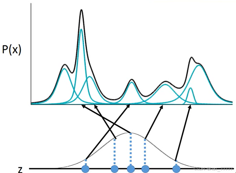 上式中p(z)代表从标准正态分布N(0,I)中随机取一个值的概率,P(x|z)代表着解码器,也就是p(z)经过神经网络后生成的均值、方差所对应的高斯分布。下图可以看出,Z分布中的每一点,都与P(X)(混合高斯分布)中某一高斯分布相对应。