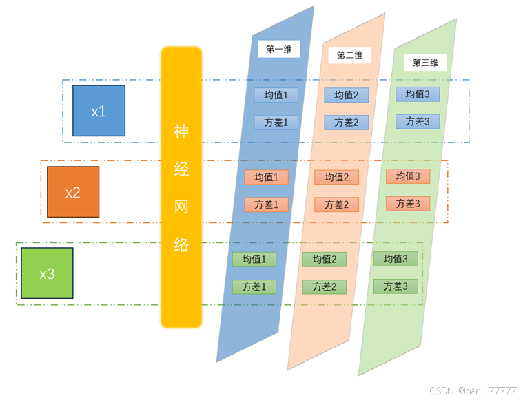 下面再举一个具体事例,再看看编码器Encoder部分,下图,现在有3个样本,分别为X1、X2、X3。样本X1经过神经网络后,假设生成一个3维高斯分布,第一维有他对应的均值、方差,第二维有他对应的均值、方差,第三维有他对应的均值、方差,在进行学习时,会让每一维度的均值、方差向标准正态分布N(0,1)逼近。同理,样本X2、X3也会生成自身唯一相对应的3维高斯分布。最终在模型学习完后,在生成新样本时,会在Z中取值,也就是标准正态分布,对应的这里的就是在一个3维标准正态分布中取值,这个值也一定是3维的,且每一维代表一特征 、一属性,比如要生成狗的图片,第一维可能代表毛色,第二维可能代表品种等等,这时就可以通过调节每一维度的值,对生成结果进行动态、指向调整。