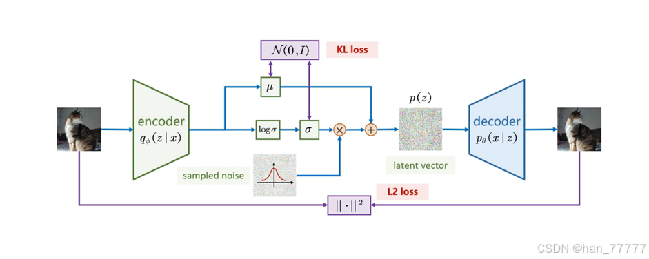最后重新总结一下整个vae训练过程,这里借用一下B站“吃花椒的麦”UP主视频里的图,