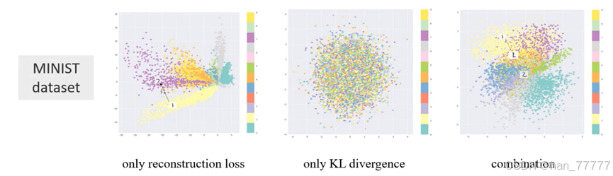 第三张图,是在模型目标函数中重构误差与最小化KL散度共同作用下,所对应的隐空间,可以看到隐空间分布连续,且同类样本分布相对聚集,不同样本有明显的分界线。