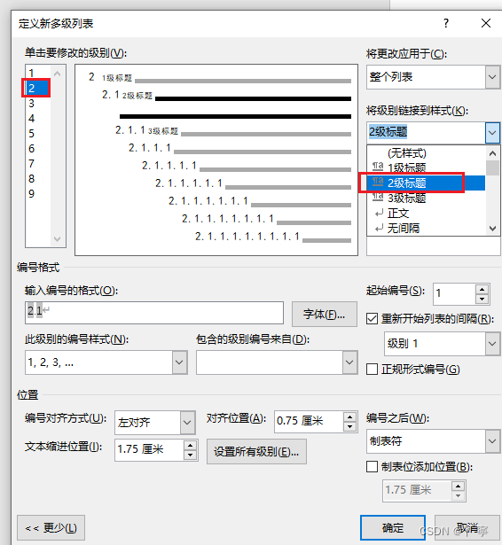 在按照上述方法进行自动排序时,刚开始的第一个文档还一切正常,但是后来有一个文档,出现排序二级标题不随一级标题号变化的情况,当时上网上找了好多办法,后来经过排查才发现是打开新文档的时候,上文中定义新的标记列表,1选择一级标题,2选择两级标题,但是打开新文档时,1选择的不是一级标题,而是其它样式(有可能是打开的文档模版自带的样式或者其它样式,例如此处错误的样式是标题1,而自己实际设置的样式起名为1级标题,需要细心排查),这就导致了,应该排序是2.1,2.2时,出现了随着一级标题1.几往下编排的问题。