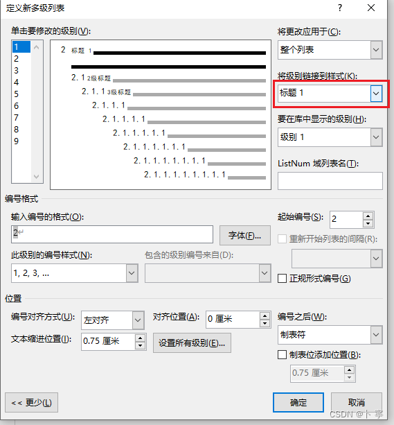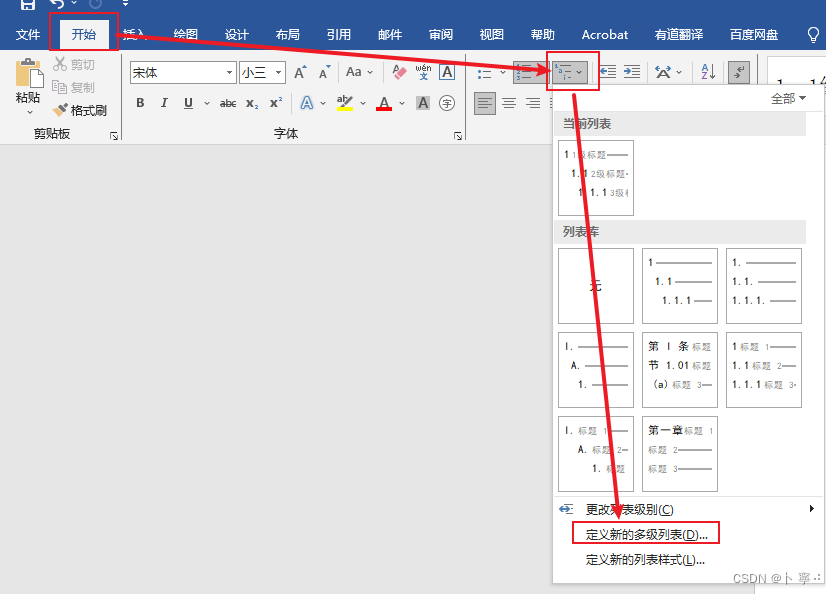 之后,打开“开始-多级列表-定义新的标记列表”选项,