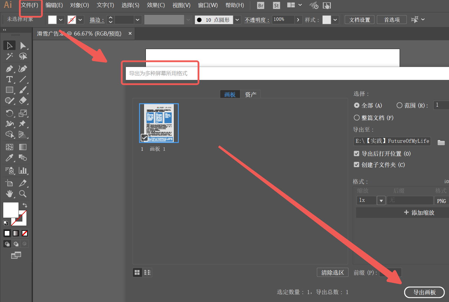 点击“导出画板”,这个时候,导出文件的大小,即为设计时候画板的大小。
