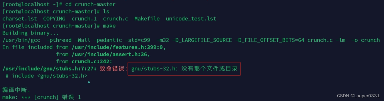 usr/include/gnu/stubs.h:7:27: 致命错误:gnu/stubs-32.h:没有那个文件或目录。四、利用字典进行远程爆破。二、Crunch安装。