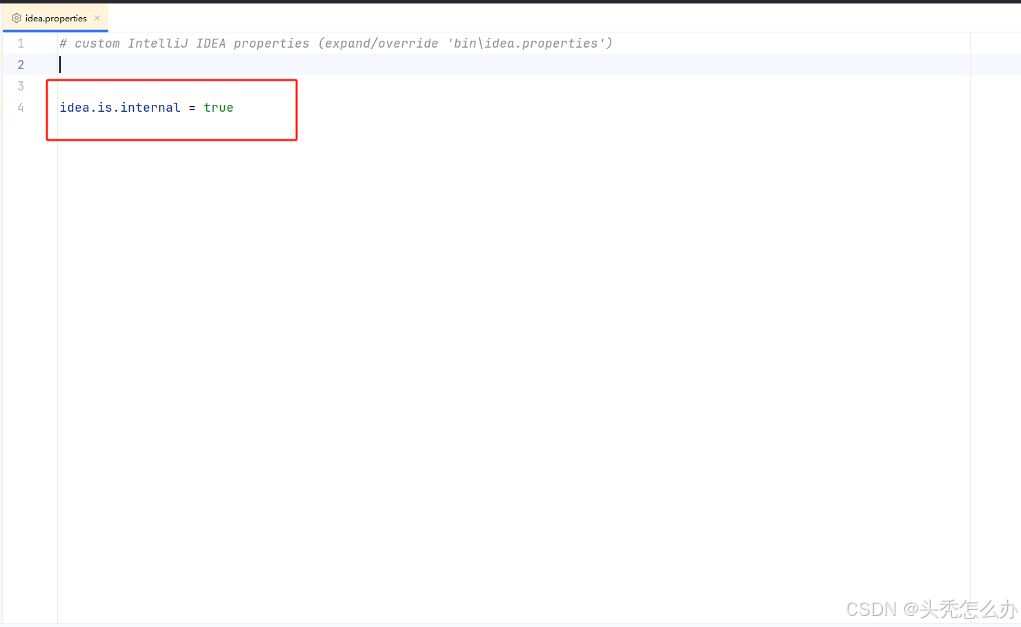 2、在打开的properties文件中输入 idea.is.internal = true 即可开启内部模式
