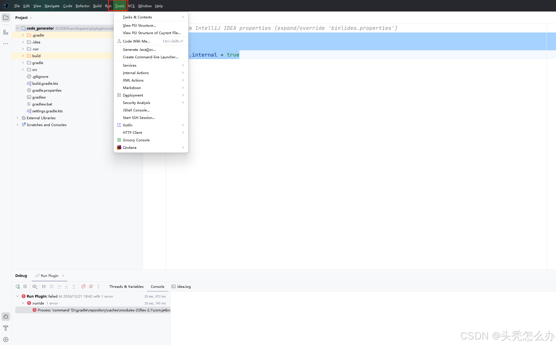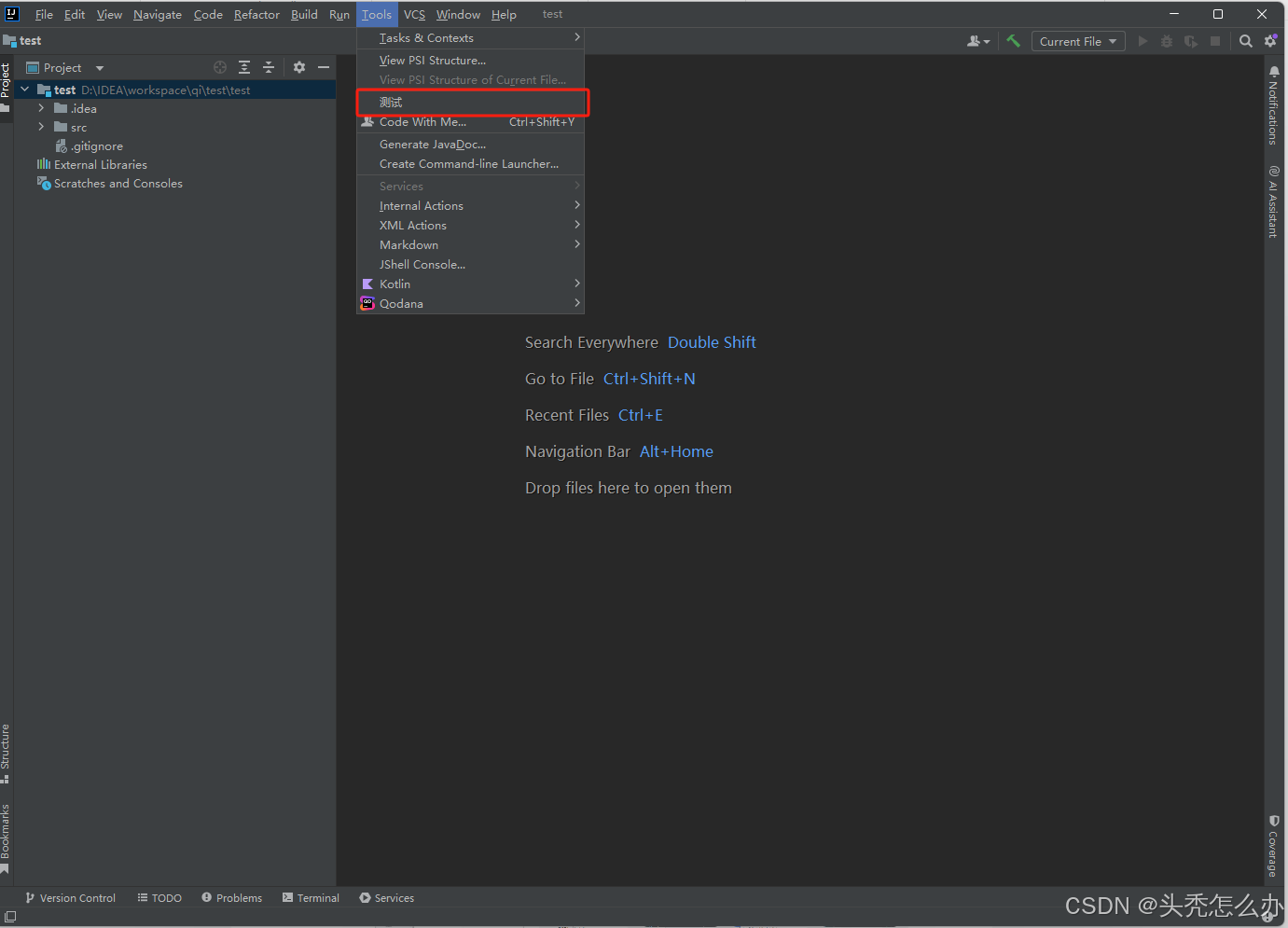 点击项目的运行后,会自动打开一个测试用的IDEA,进入项目后点击主菜单的 Tools 会发现多了一个名字叫测试的按钮