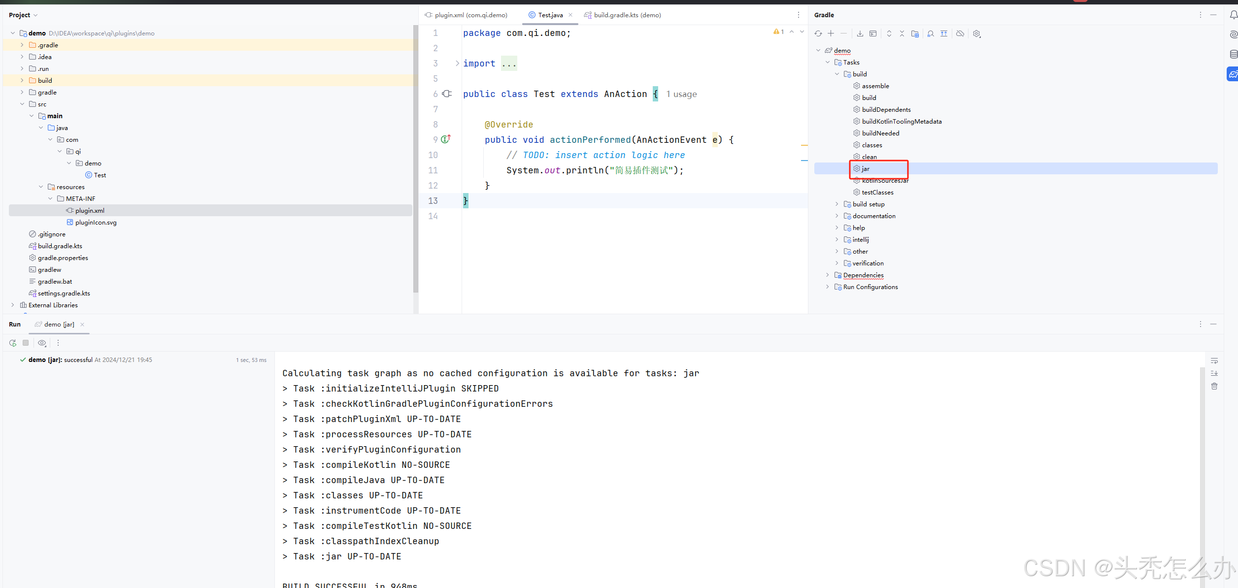 在IDEA的 settings 下的 Plugins 页面点击设置,选择从磁盘安装,选择这个jar包,即可在项目中使用刚刚打包的插件