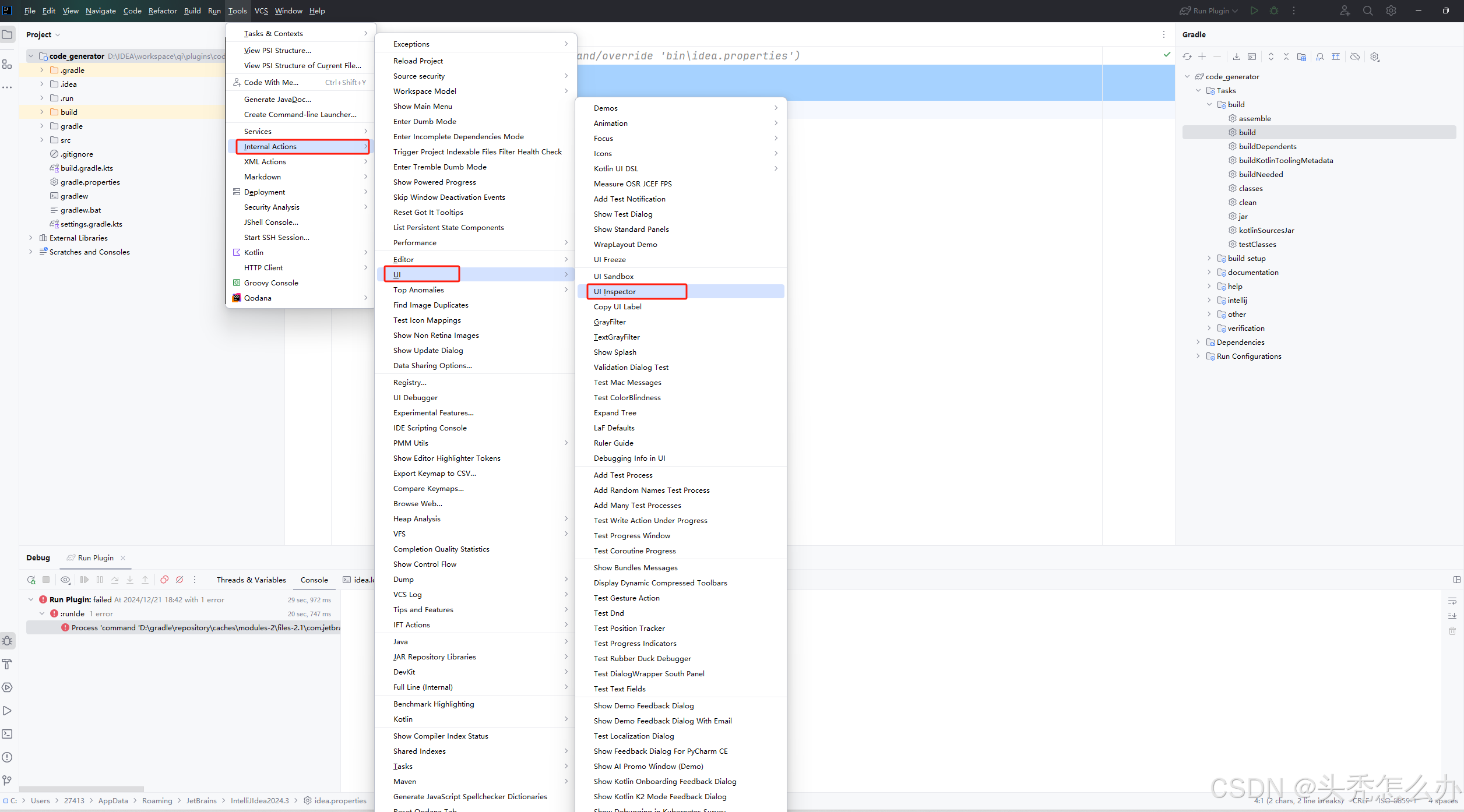 内部模式可以使用UI检查器,用来定位IDEA中的各个按钮使用什么action。