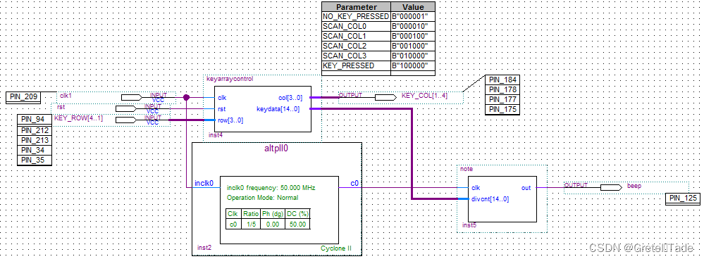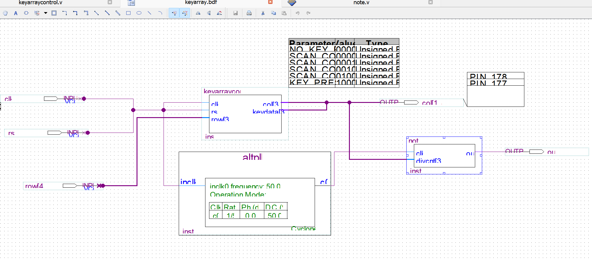 - 在 keyarray.bdf 文件中,在空白处双击鼠标左键,添加锁相环模块(altpll)其配置参数为输入 50MHz,输出 10MHz。在 Symbol 对话框左上角的 libraries 中,分别将 Project 下的 keyarraycontrol、note 模块放在图形文件 keyarray.bdf 中,加入输入、输出引脚,双击每个引脚,进行引脚命名,并锁定管脚,将未使用的引脚设置为三态输入(一定要设置,否则可能会损坏芯片);