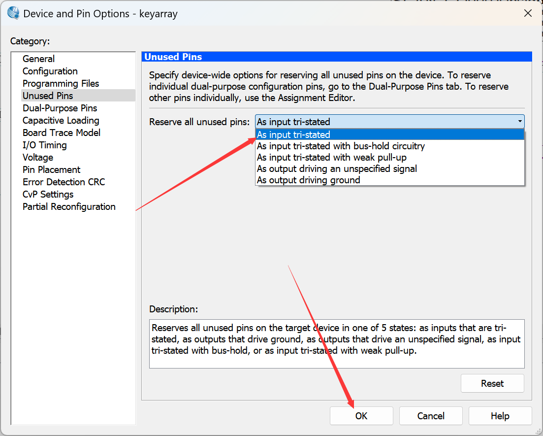 弄好了之后就是最后一步操作了,把没用到的管脚设置三态,然后烧录文件。