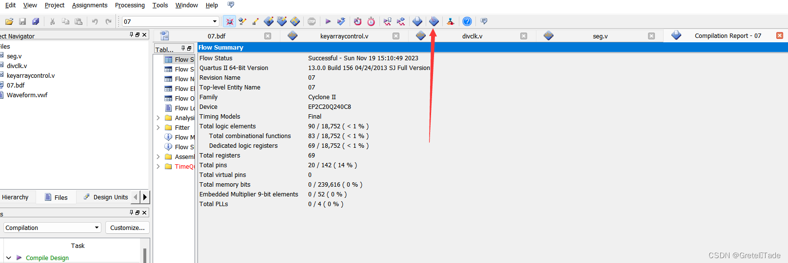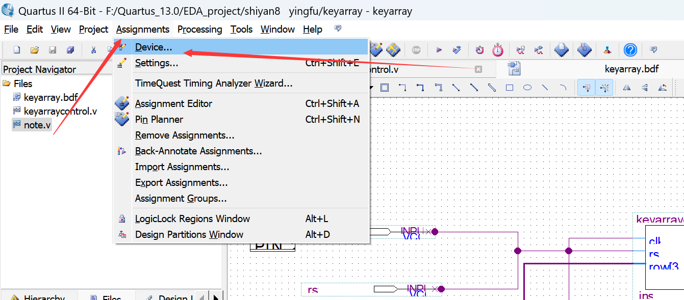 6. 将 keyarray.bdf 设置为顶层实体。对该工程文件进行全程编译处理,若在编译过程中出现 错误,则找出错误并更正,直至编译通过为止;