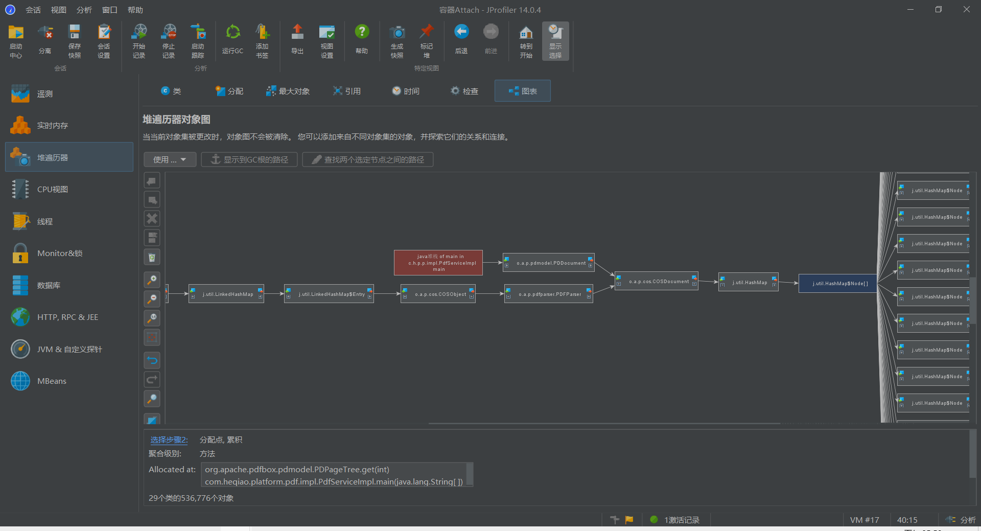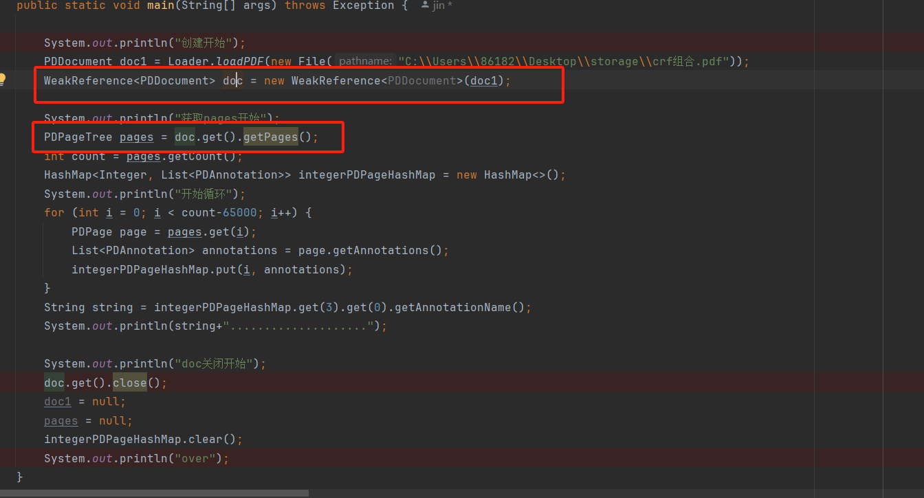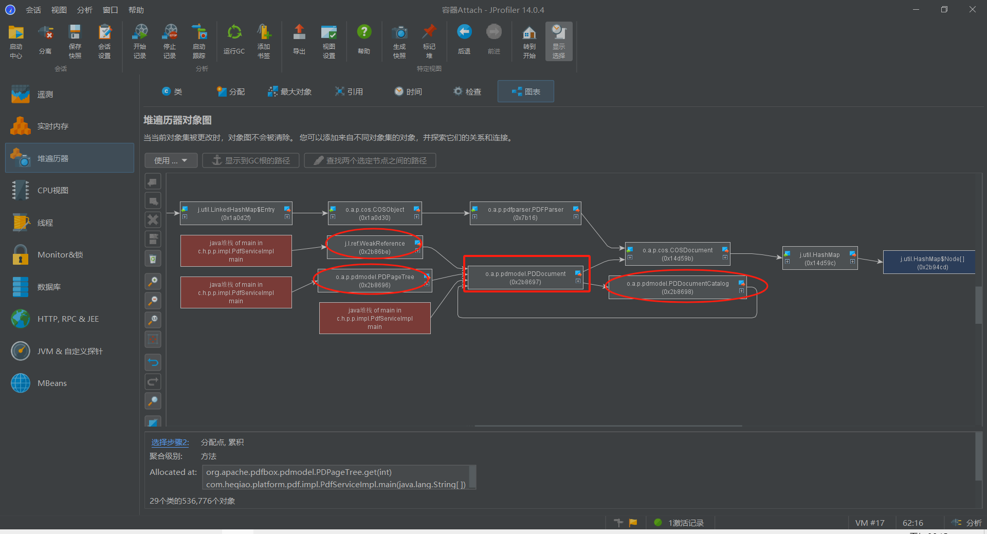 比如如图红方框出的PDDocument对象被三个红圆框的对象引用。其中PDDocumentCatalog和自己属于循环引用,而WeakReference、PDPageTree则直接连接到堆栈的GC根,因此这两个是应当被线程所持有的直接的变量对象,因此对这两个对象的赋值和操作也是直接在线程中的,如果要解除PDDocument对象的传入引用,则应当先将这两个对象在代码中置空或关闭