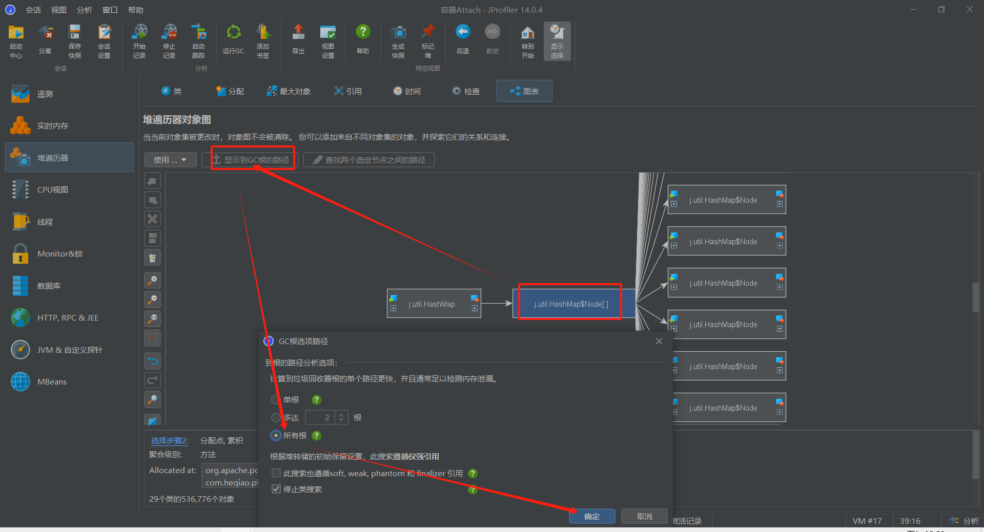 得到如图表所示,点击该对象,点击显示到GC根的路径(即GC Root ,它是 JVM 垃圾回收器判断对象是否存活的起点。如果一个对象可以通过一条由 GC Root 出发的引用链访问到,则它被认为是存活的 ,不会被回收。这个功能可以用于帮助开发者定位对象无法被 GC 回收的根本原因,常见的 GC Root 类型有线程栈变量、JNI 全局引用、静态字段、锁对象、常量引用、类加载器等)