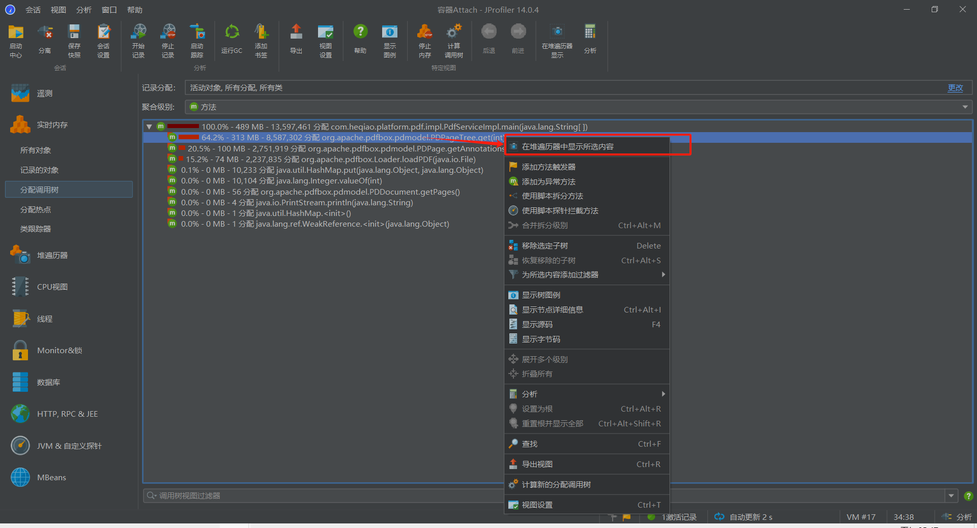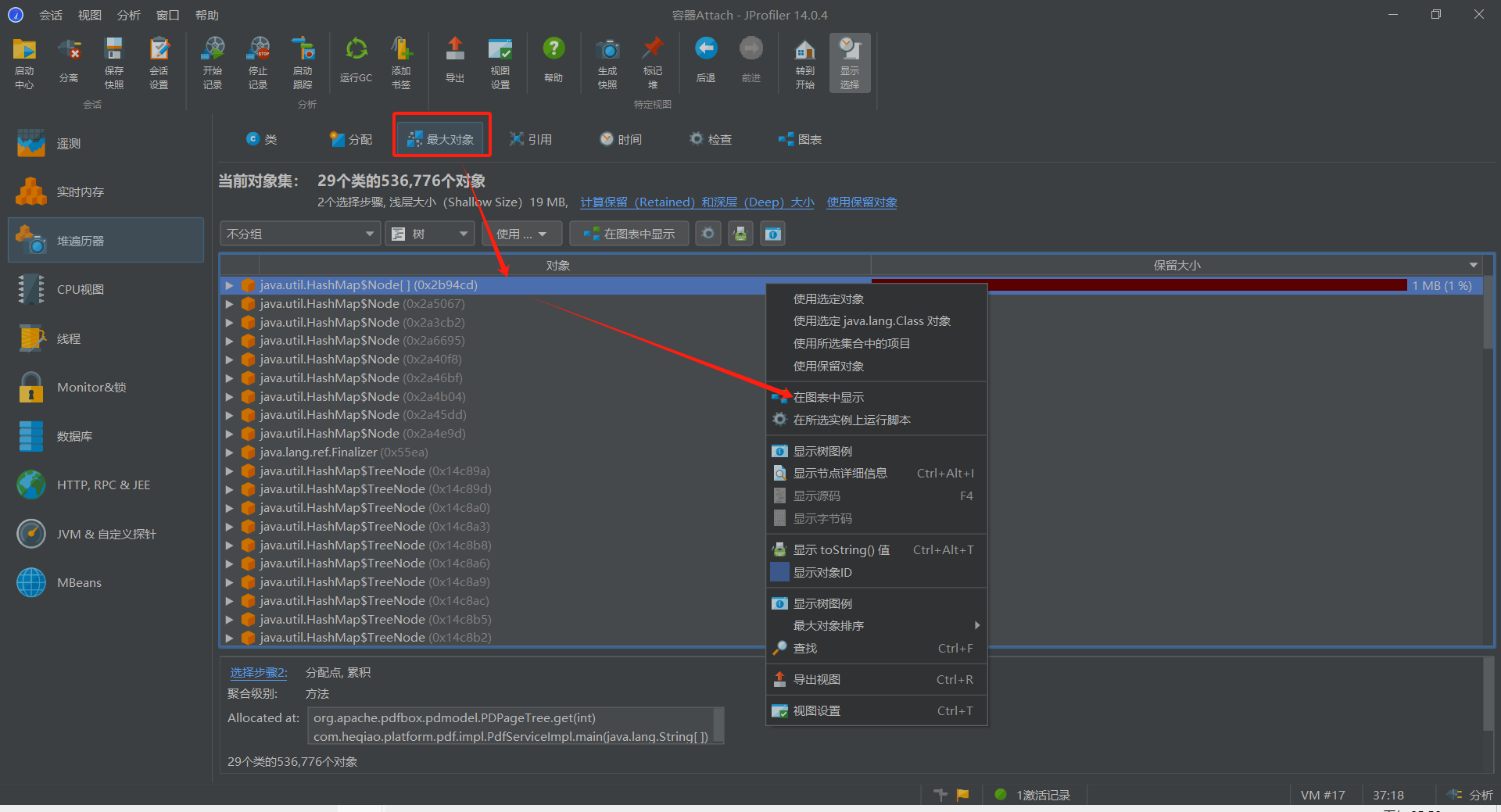 由此图即可排查被哪些对象强引用而导致内存无法GC释放,图中可见,该最大对象实例被PDDocument及HashMap所强引用,因此要GC PDPageTree类,需要首先将强引用它的这两个对象置空(在某个对象上右键,显示传入引用 指用到当前这个对象的,显示传出引用 指当前这个对象用到的对象)