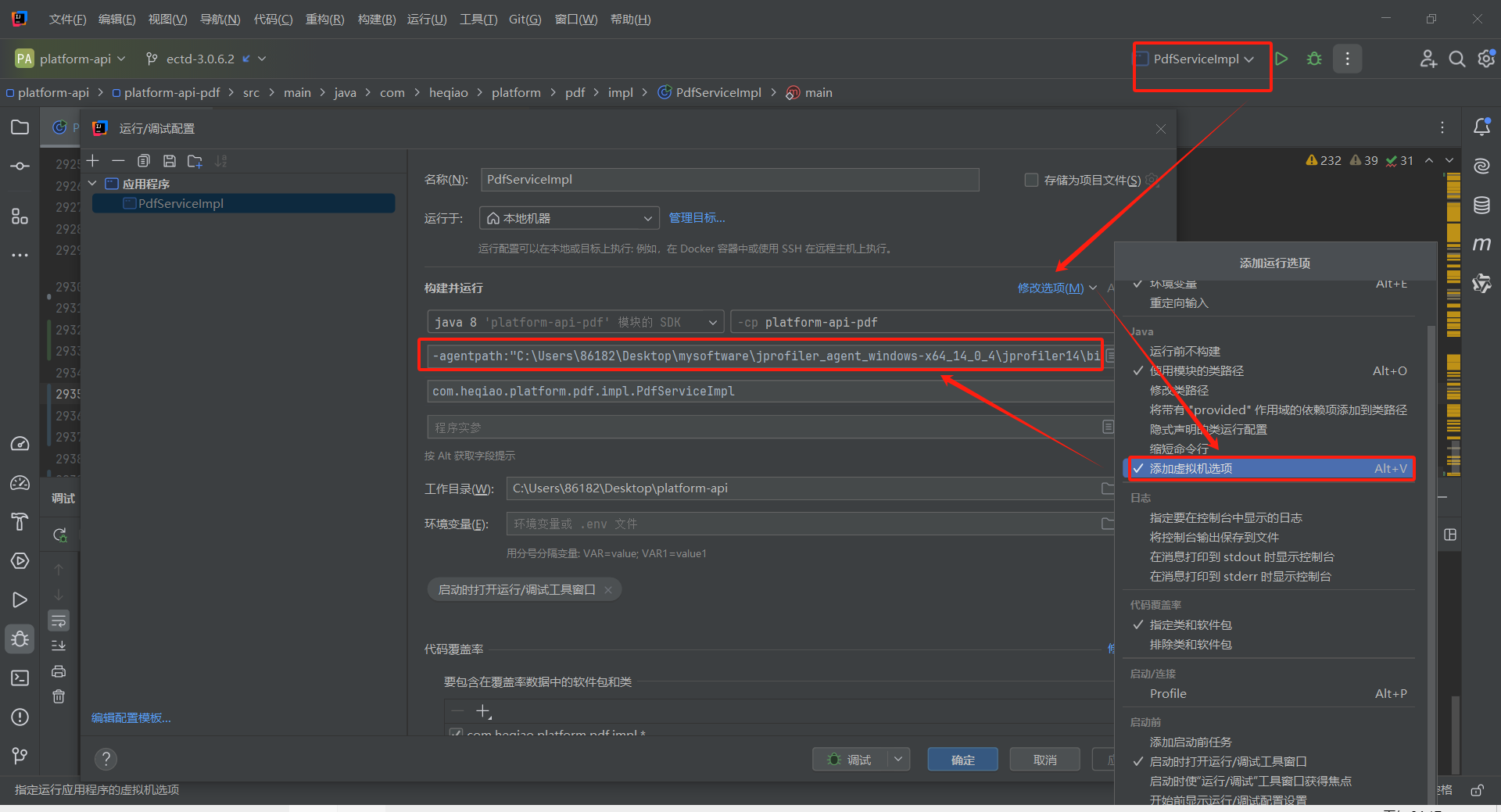 如果需要Debug分析本地代码,并断点在某一行查看内存情况或者变化时,需要在IDEA的启动的应用程序配置中增加VM选项,并配置JProfiler在本地的代理文件路径及端口,然后Debug启动。