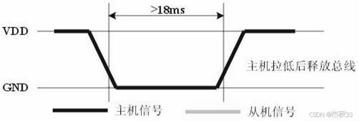 DHT11通过单根数据线实现双向通信,关键时序包括: