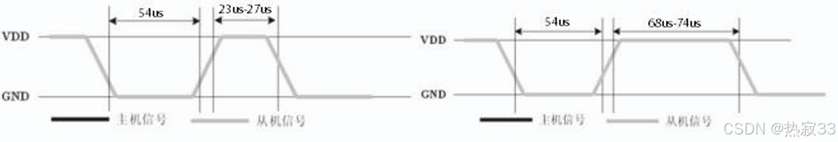 - 数据传输:每bit以50μs低电平开始,高电平长度区分0/1(26-28μs为0,70μs为1)