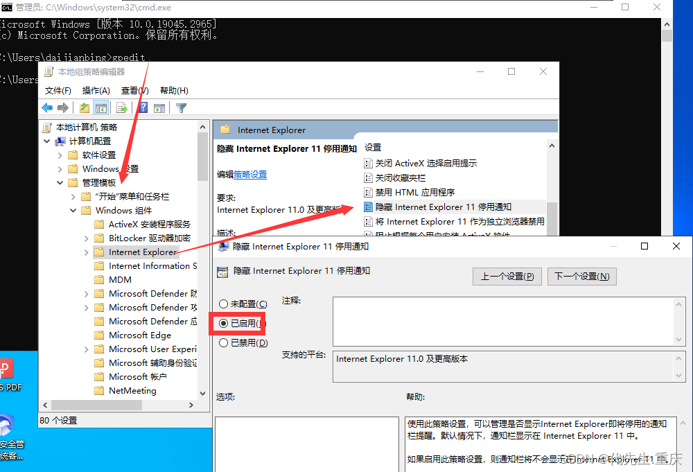 启用隐藏 internet explorer 11 停用通知,如下图所示