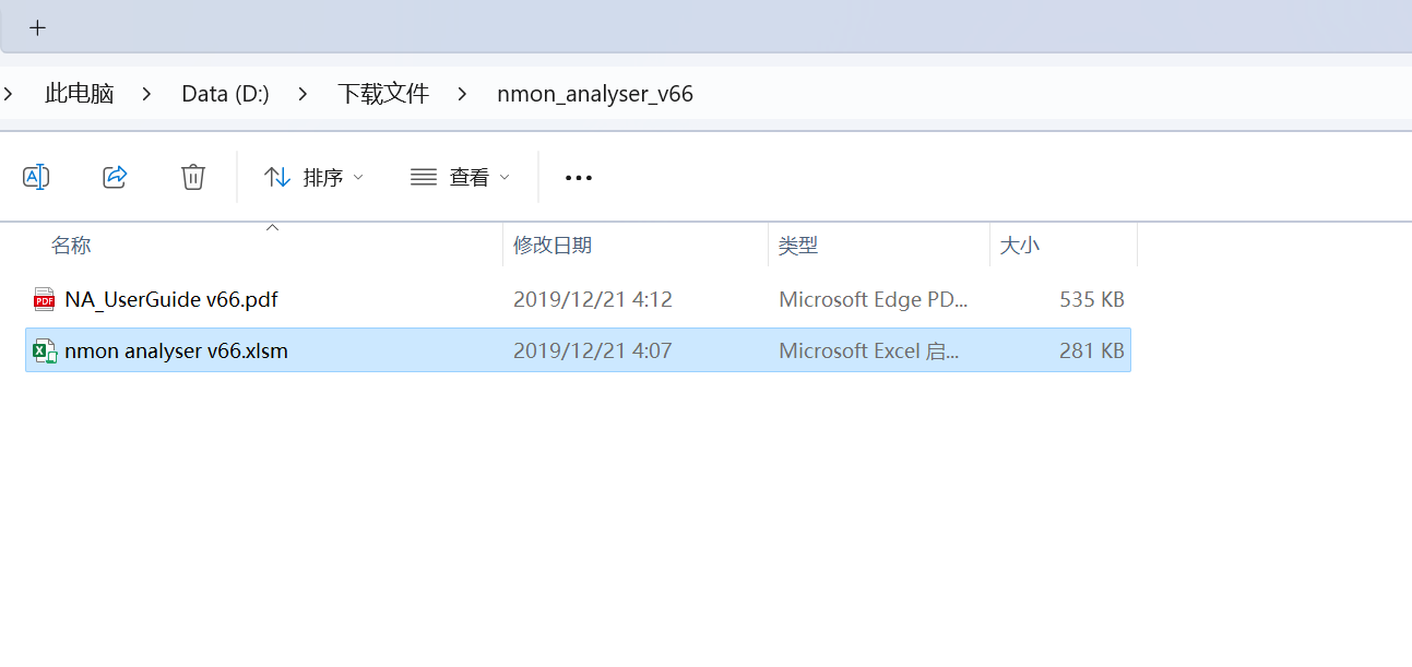 3. 这个文件用于 windows ,将nmon文件转换为折线图。下载后直接解压会得到一个 xlsm 文件(nmon analyser v69_2.xlsm) ,使用 Excel 打开即可使用