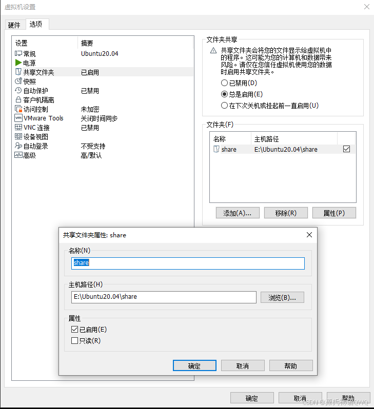 在win10系统下用VMware Workstation Pro运行Ubuntu20.04,在主机和虚拟机之间启用共享文件夹,放入文件后在Ubuntu中找不到共享文件夹