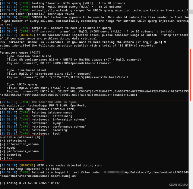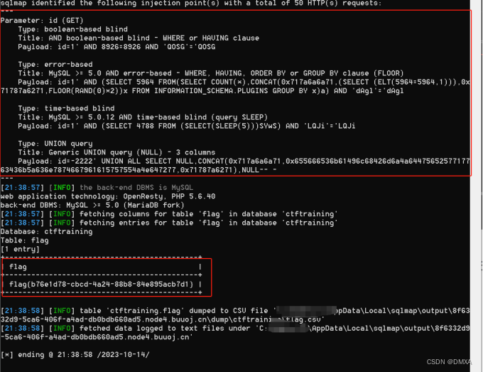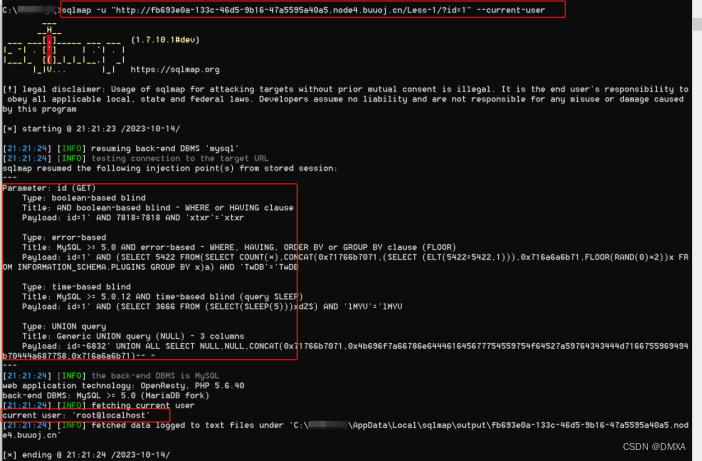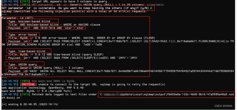 注入完成后,可以看到执行的注入类型以及payload有:布尔盲注、报错注入、时间盲注、union注入