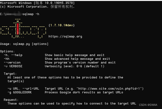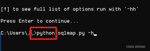 解压后在目标文件夹下打开cmd,运行python sqlmap.py -h