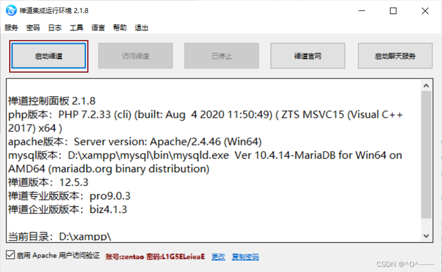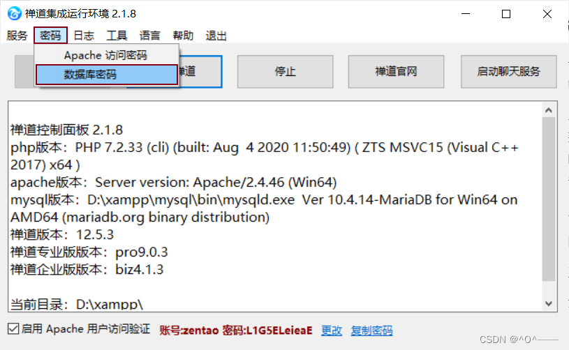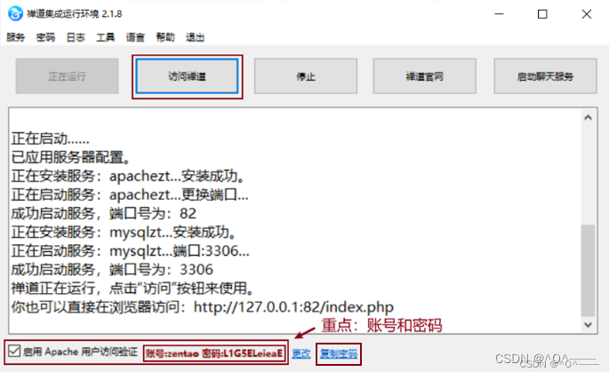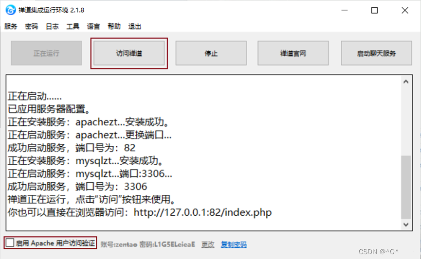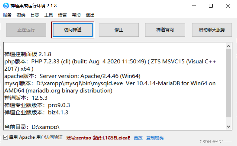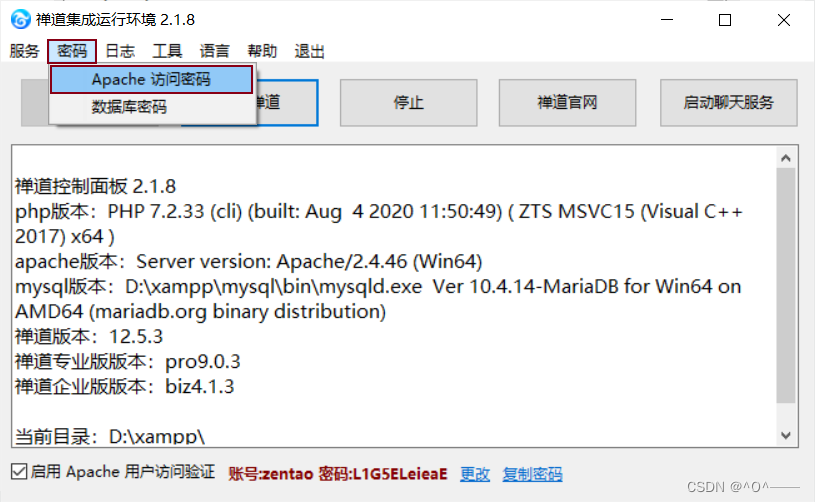 勾选 启动 Apache 用户访问验证,然后点击 访问禅道(注意:接下来的步骤要依赖于右边的账号:和密码:),点击 复制密码;