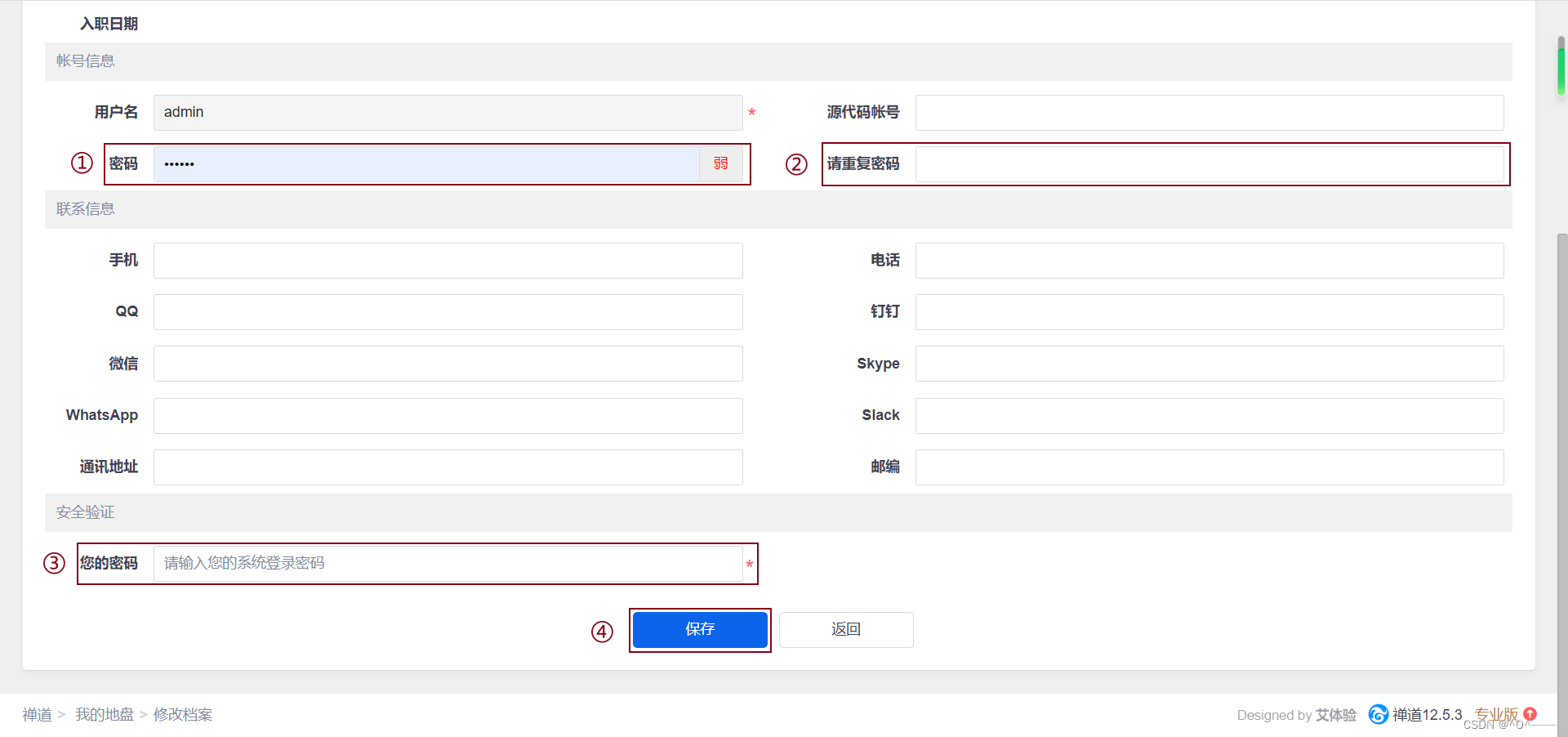 3.在 ①密码 输入 新密码;在 ②请重复密码 输入确认密码;在 ③您的密码 输入 旧密码;然后点击 ④保存;