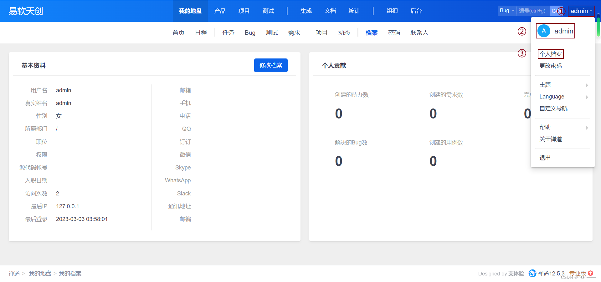 1.点击右上侧的 ①用户名, 选择 ②用户头像 or ③个人档案;