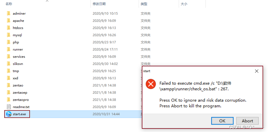 这样放的后果:操作到后面步骤点击 start.exe 启动时会出现如下错误: