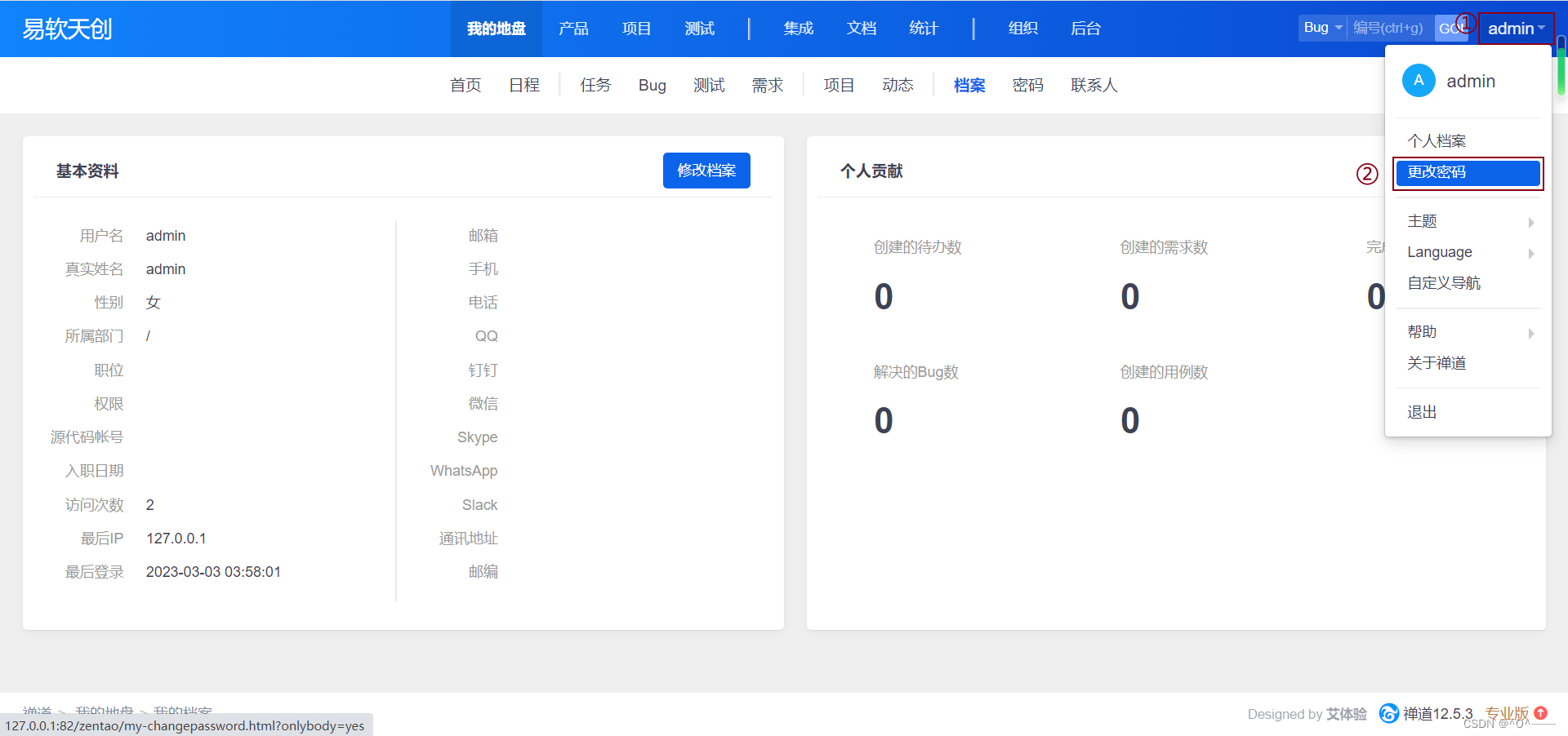 1.点击右上侧的 ①用户名,点击 ②修改密码;