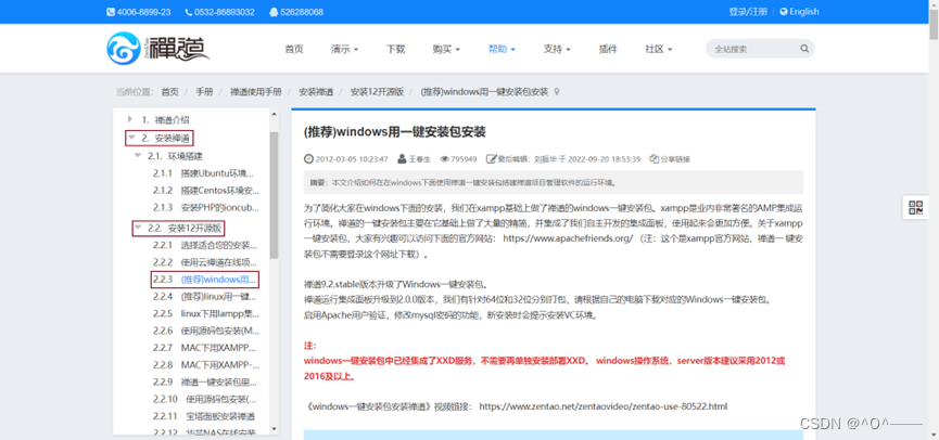 2.选择 2.安装禅道 ,选择 2.2安装12开源版 ,点击(推荐)windows用一键安装包安装 ;
