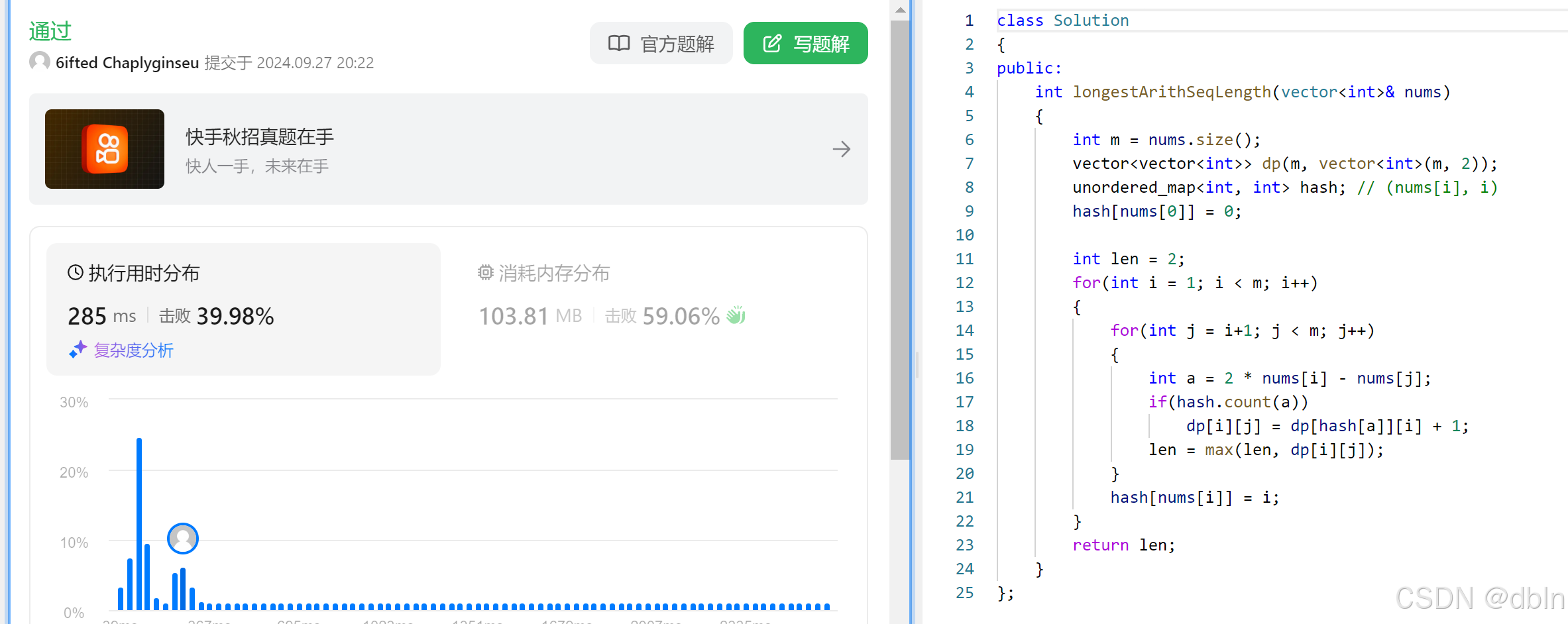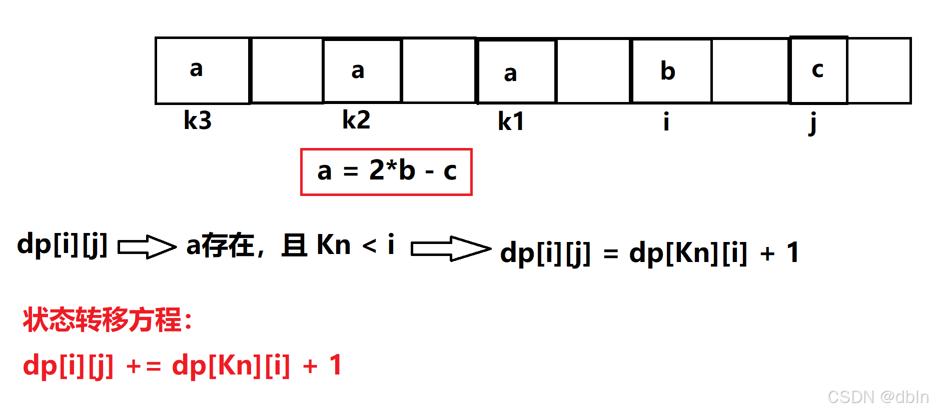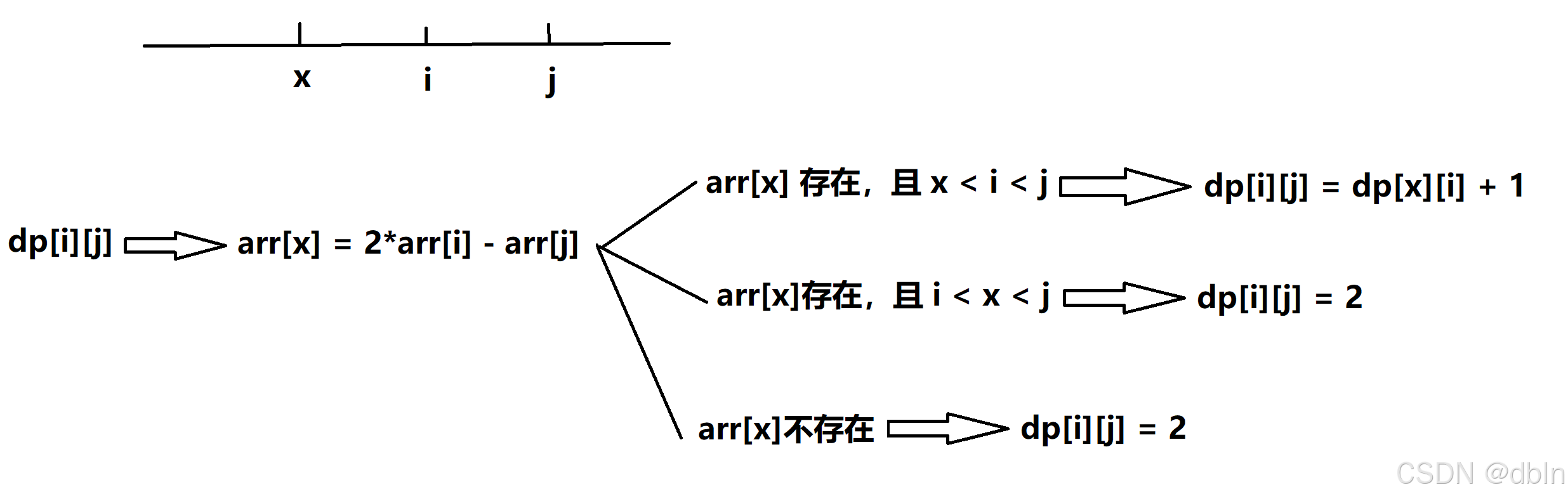 dp[i][j]:表示以 i 位置元素和 j 位置元素为结尾的最长等差数列的长度。