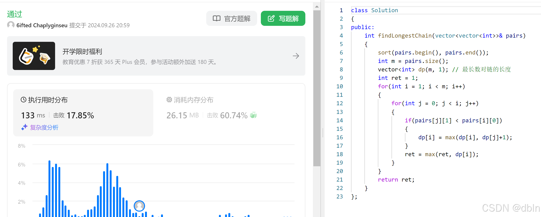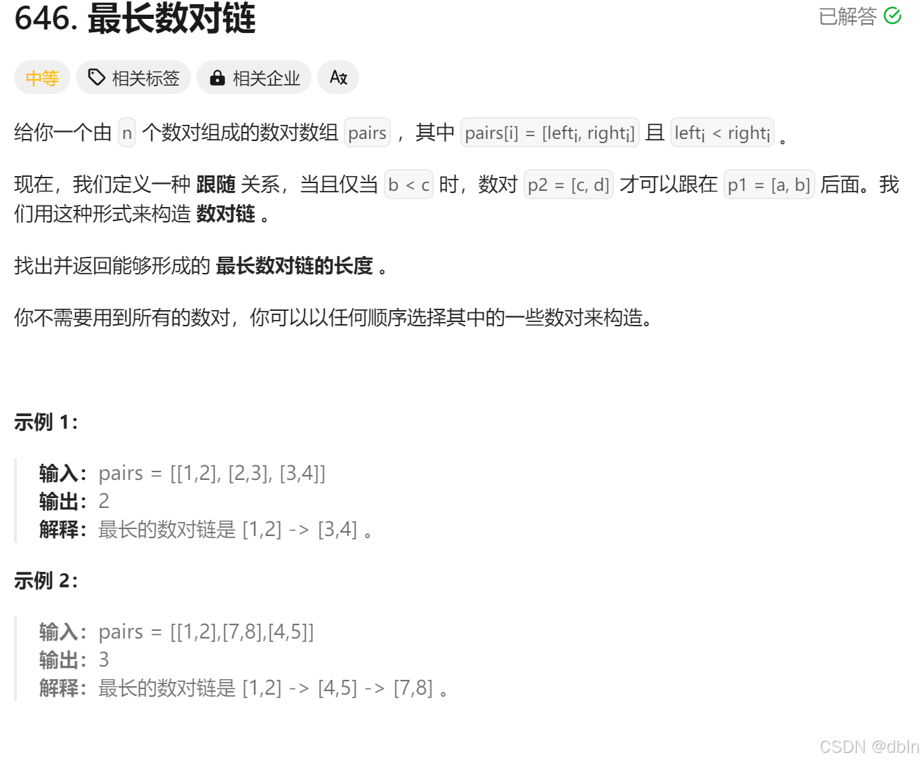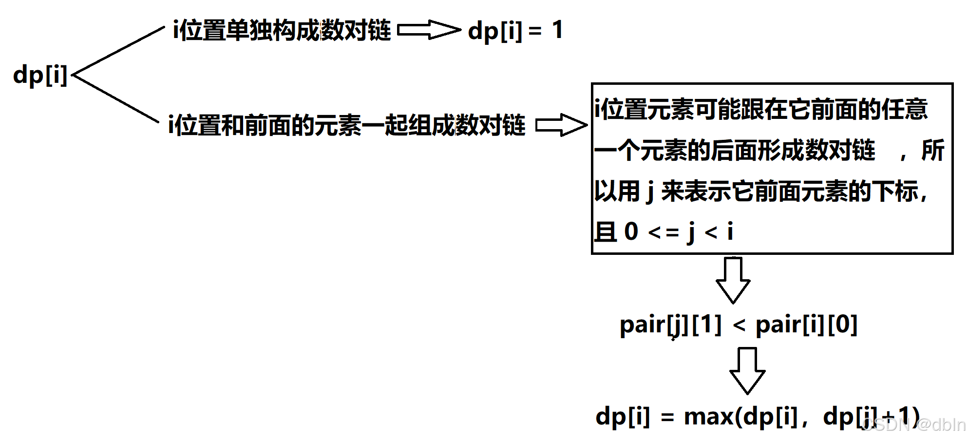 dp[i]:表示以 i 位置元素为结尾的所有数对链,最长的数对链的长度。