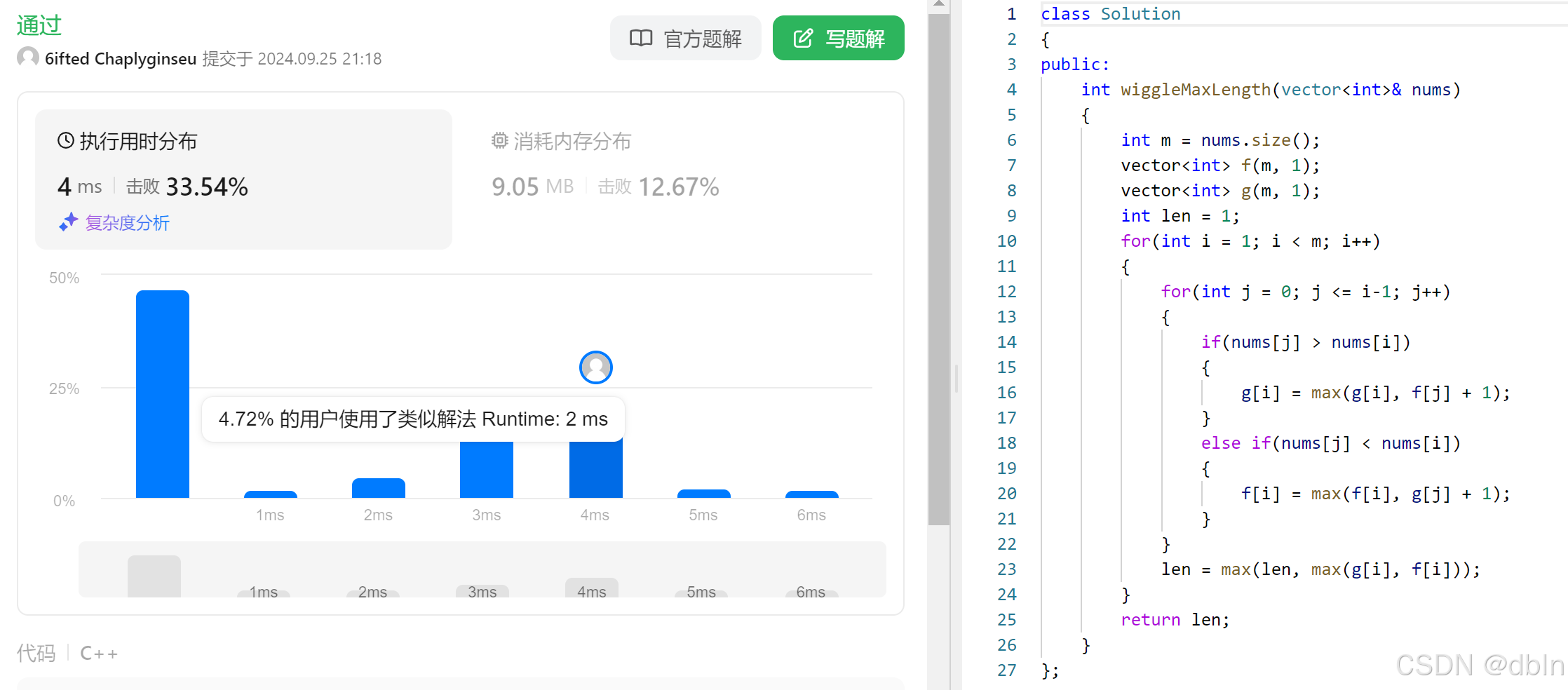 比如上面示例2,如果 i 位置元素是11,那么它的前面可以是1,3,7等等,无法确定它前面具体是哪一个元素。dp[i][j]:表示以 i 位置元素和 j 位置元素为结尾的最长的斐波那契子序列的长度。(其中规定i < j)。f[i]:表示以 i 位置元素为结尾的所有子序列中,最后一个位置呈现上升趋势的最长摆动序列的长度。g[i]:表示以 i 位置元素为结尾的所有子序列中,最后一个位置呈现下降趋势的最