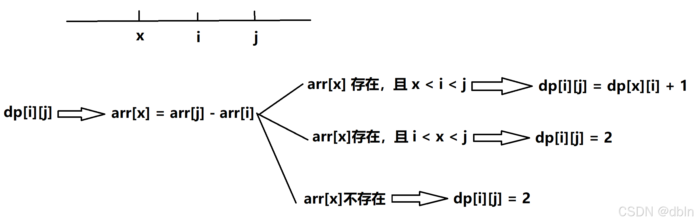 dp[i][j]:表示以 i 位置元素和 j 位置元素为结尾的最长的斐波那契子序列的长度。(其中规定i < j)。