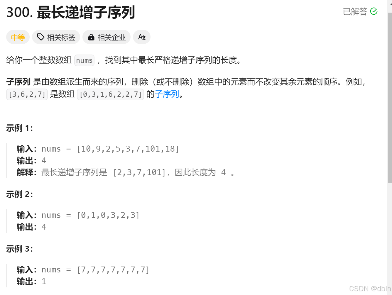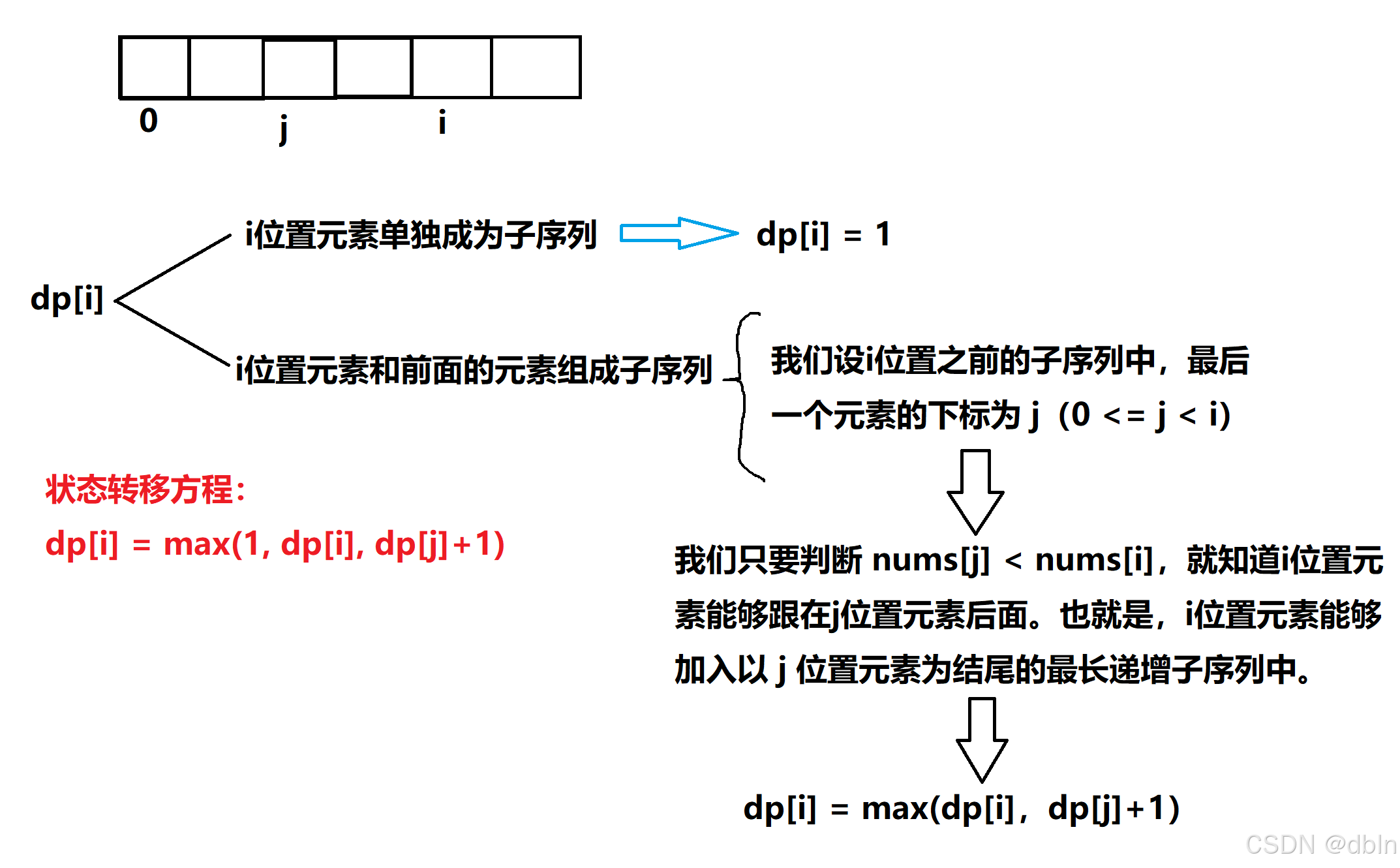 dp[i]:以 i 位置元素为结尾的所有子序列中,最长递增子序列的长度。