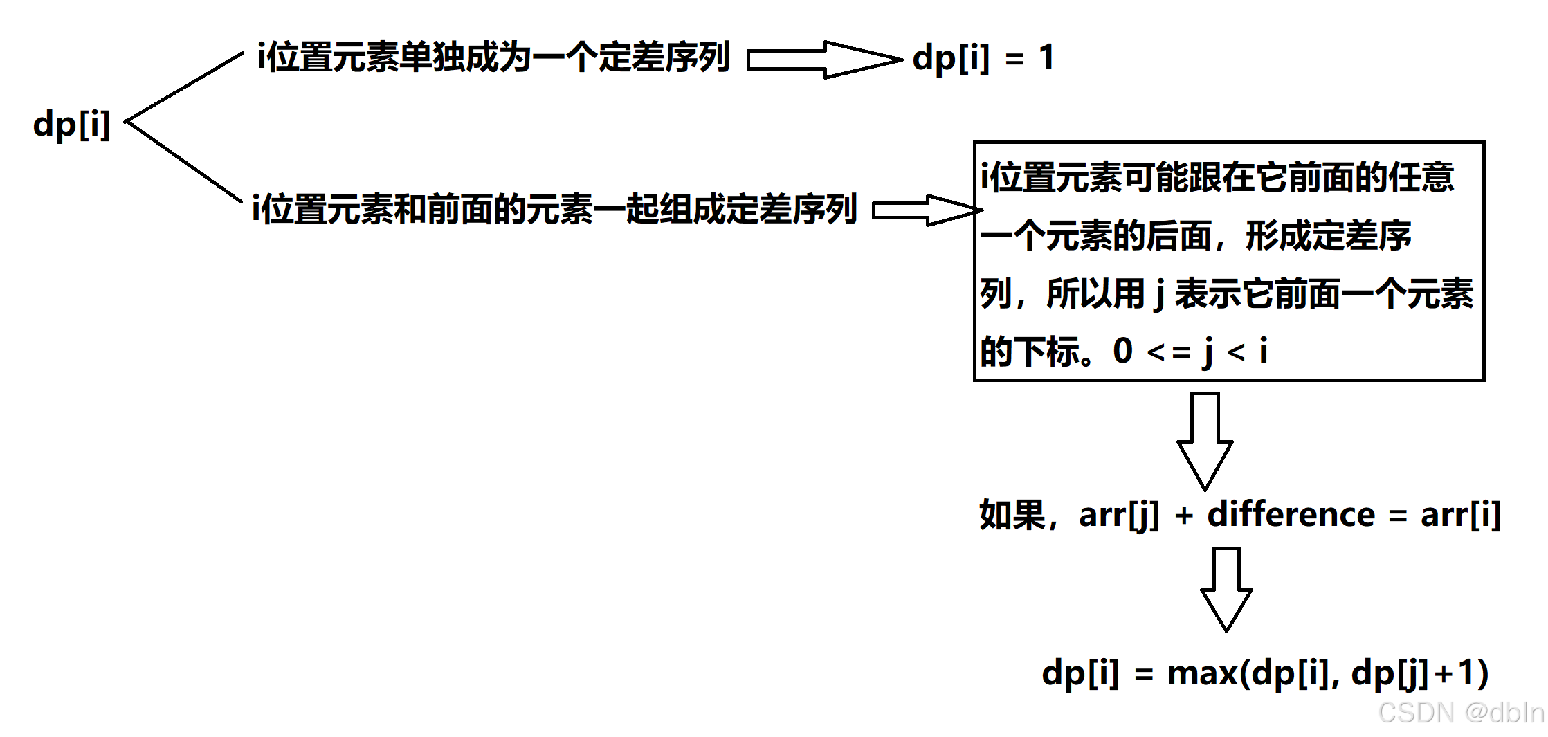 dp[i]:表示以 i 位置元素为结尾的最长定差子序列的长度。