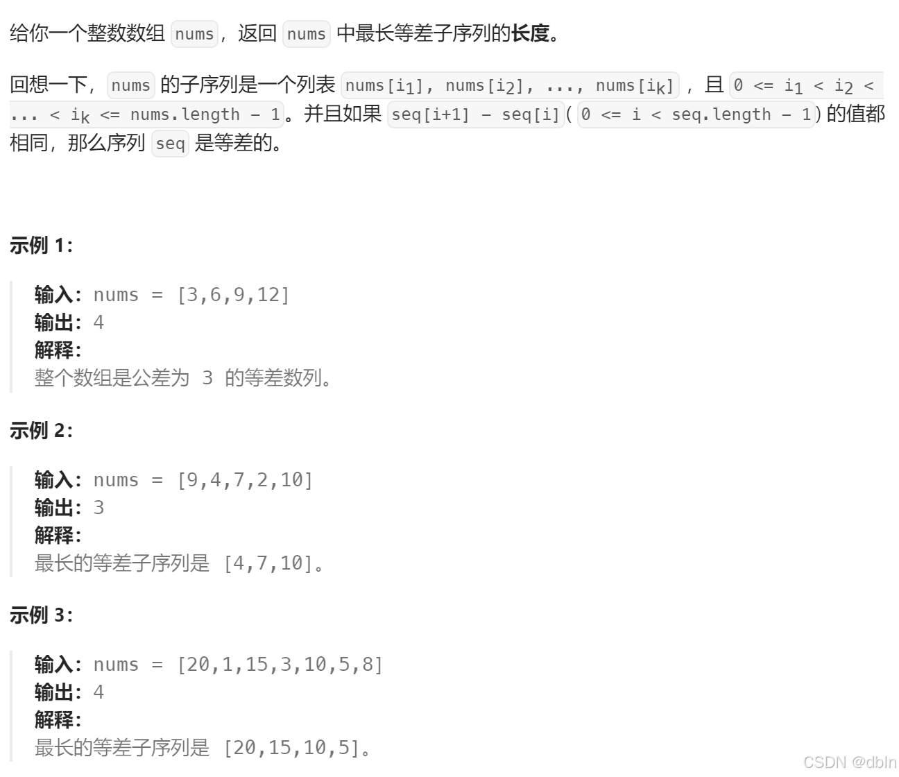 初步思考:dp[i]表示以 i 位置元素为结尾的最长的等差序列的长度。按照之前的思路,我们需要去找 i 位置元素的前一个元素。可是,对于等差数列来说,我们能够根据一个元素去确定它的前一个元素吗?