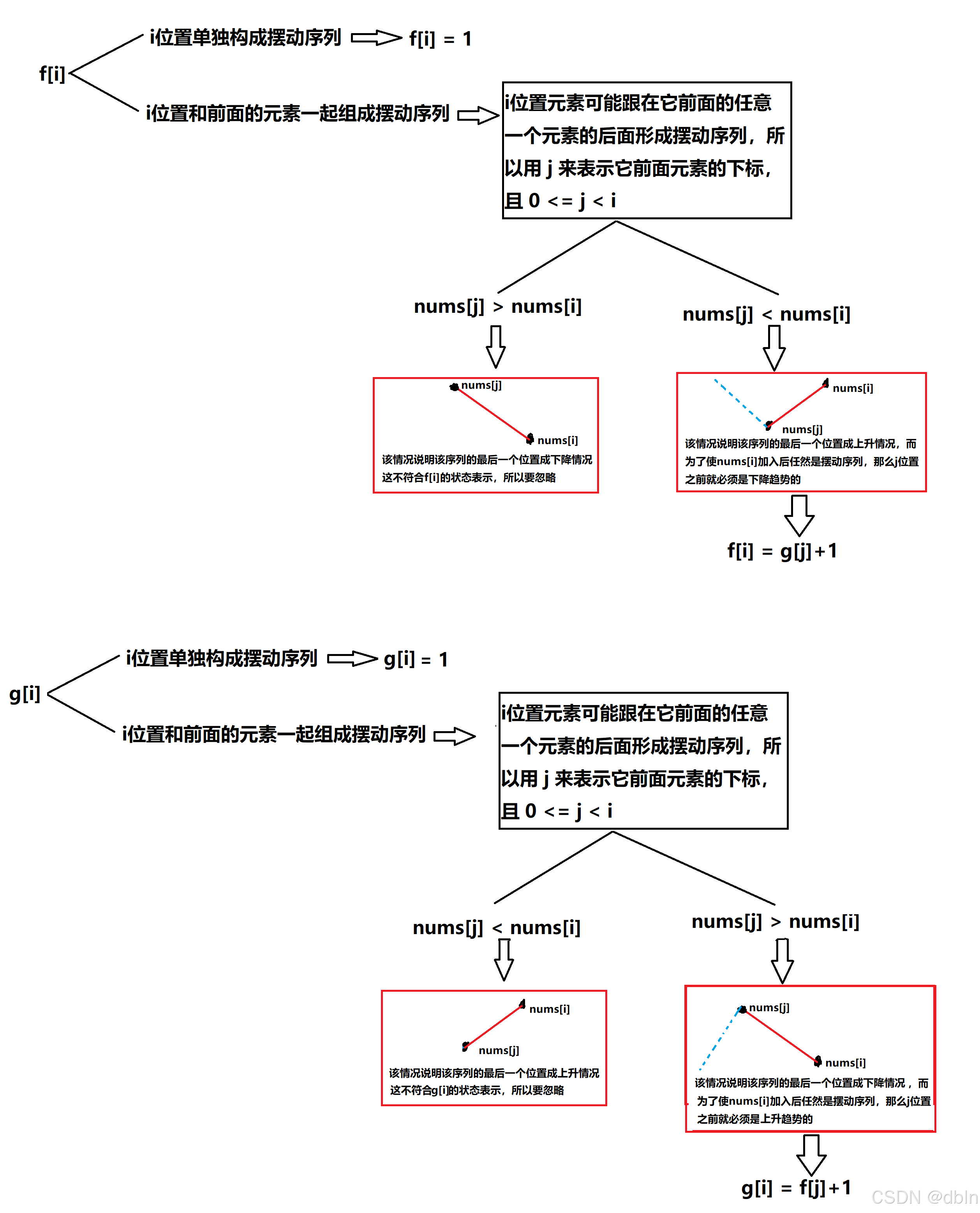 g[i]:表示以 i 位置元素为结尾的所有子序列中,最后一个位置呈现下降趋势的最长摆动序列的长度。