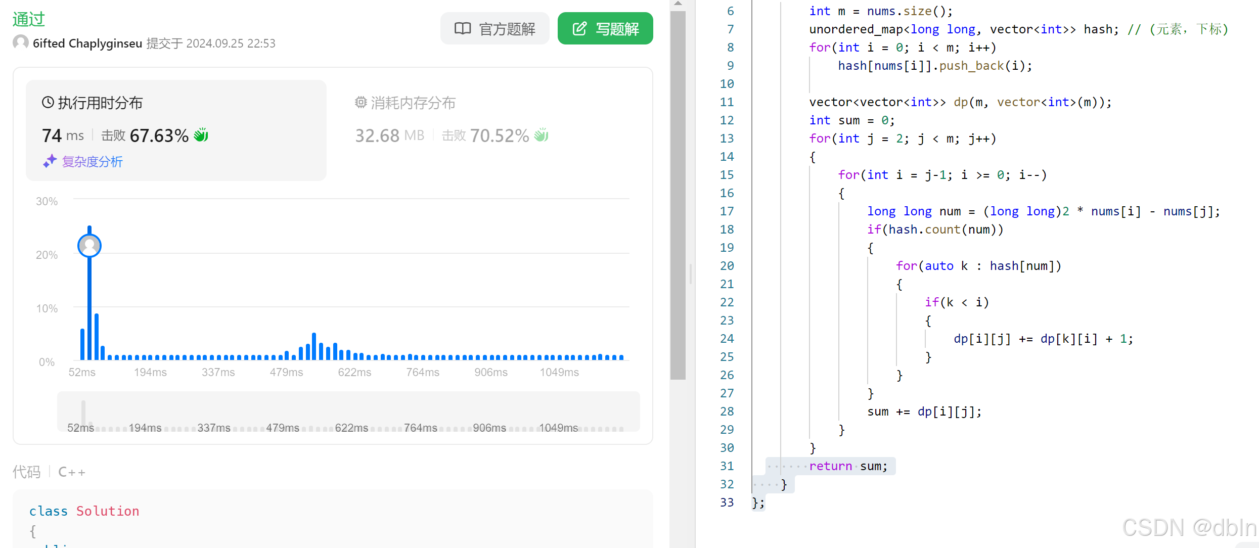 dp[i][j]:表示以 i 位置元素和 j 位置元素为结尾的等差子序列的个数。