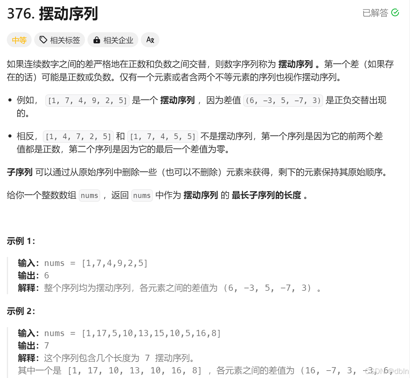 根据题目要求,题目要求找到作为摆动序列的最长子序列的长度。所以dp[i]表示以 i 位置元素为结尾的所有子摆动序列中,最长摆动序列的长度。