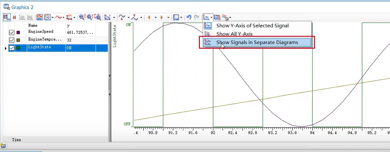 设置每个信号显示在独立的坐标系下,graphic菜单栏标题栏select y-axis view——show signals in seperate diagrams