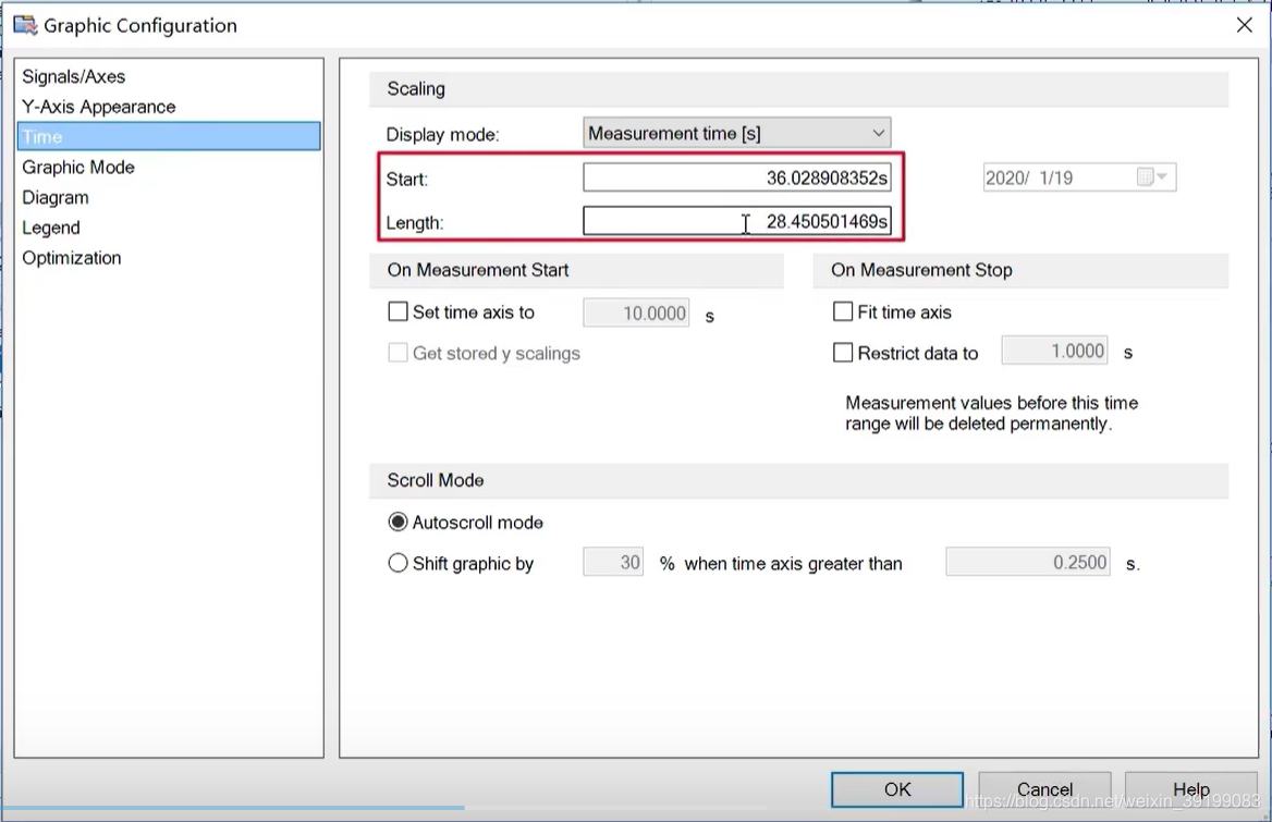 graphic configuration对话框下点击左侧的time可以设置横轴范围:
