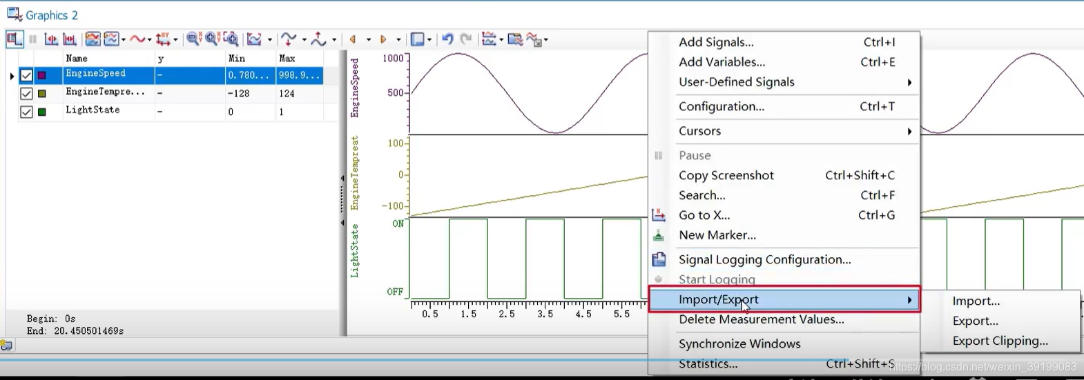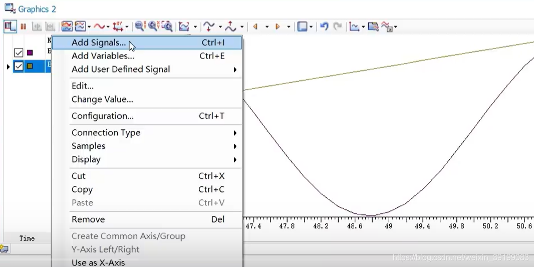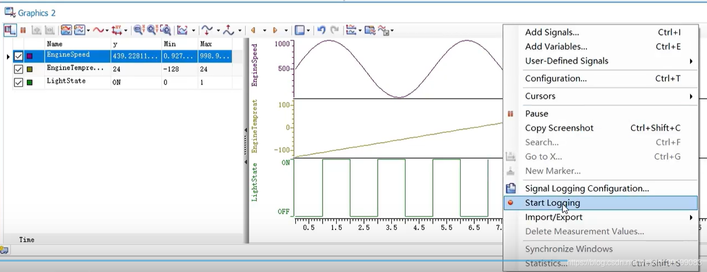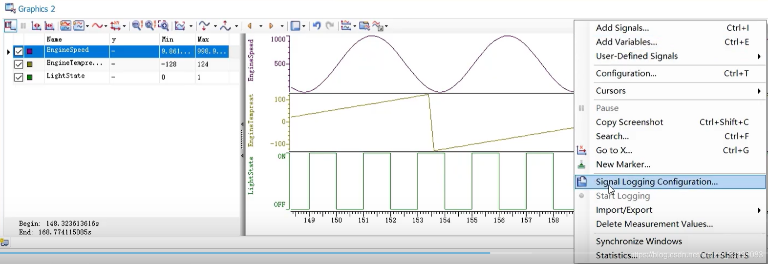 记录信号前需先配置信号记录的设置,在graphic窗口显示区域右键选择signal logging configuration