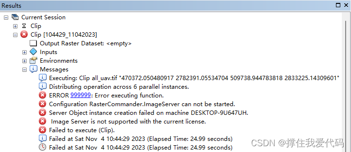 如图:发生ERROR999999的报错,这时,需要在【Clip】窗口的【Environments】 中选择【Parallel Processing】,将【Parallel Processing Factor】设置为0。